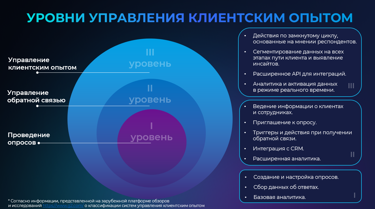Успешное решение задач по управлению опросами, обратной связью или клиентским опытом во многом зависит от выбора подходящего решения. Для западных систем существует устоявшаяся классификация, одна эти решения, в большинстве своем теперь недоступны для российских компаний. Российские системы, конечно, доступны, но нет публичной информации об уровне зрелости этих решений.